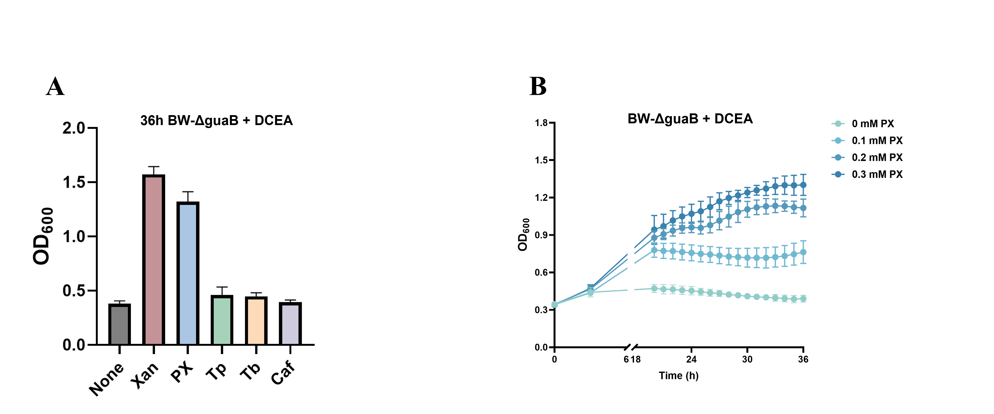 The sensor comprises a catalytic module, NdmB, and a sensor module, the pYB1s-ndmDCEA plasmid. Bacteria can only survive when NdmB catalyzes caffeine to produce paraxanthine (PX), and pYB1s-ndmDCEA degrades PX into xanthine. To validate the effectiveness of the sensor system, the pYB1s-ndmDCEA plasmid was introduced into an Escherichia coli (E. coli) strain with the guaB gene knocked out. Control experiments revealed that the strain showed optimal growth in media containing xanthine and PX, in contrast to media supplemented with theobromine (Tb), theophylline (Tp), caffeine, or media without additional xanthine compounds. These results confirmed the necessity of PX for bacterial growth (Figure 1A). Moreover, different concentrations of PX were tested to observe bacterial growth, and a positive correlation between growth and PX concentration was observed, demonstrating that the sensor successfully detects and utilizes PX (Figure 1B).