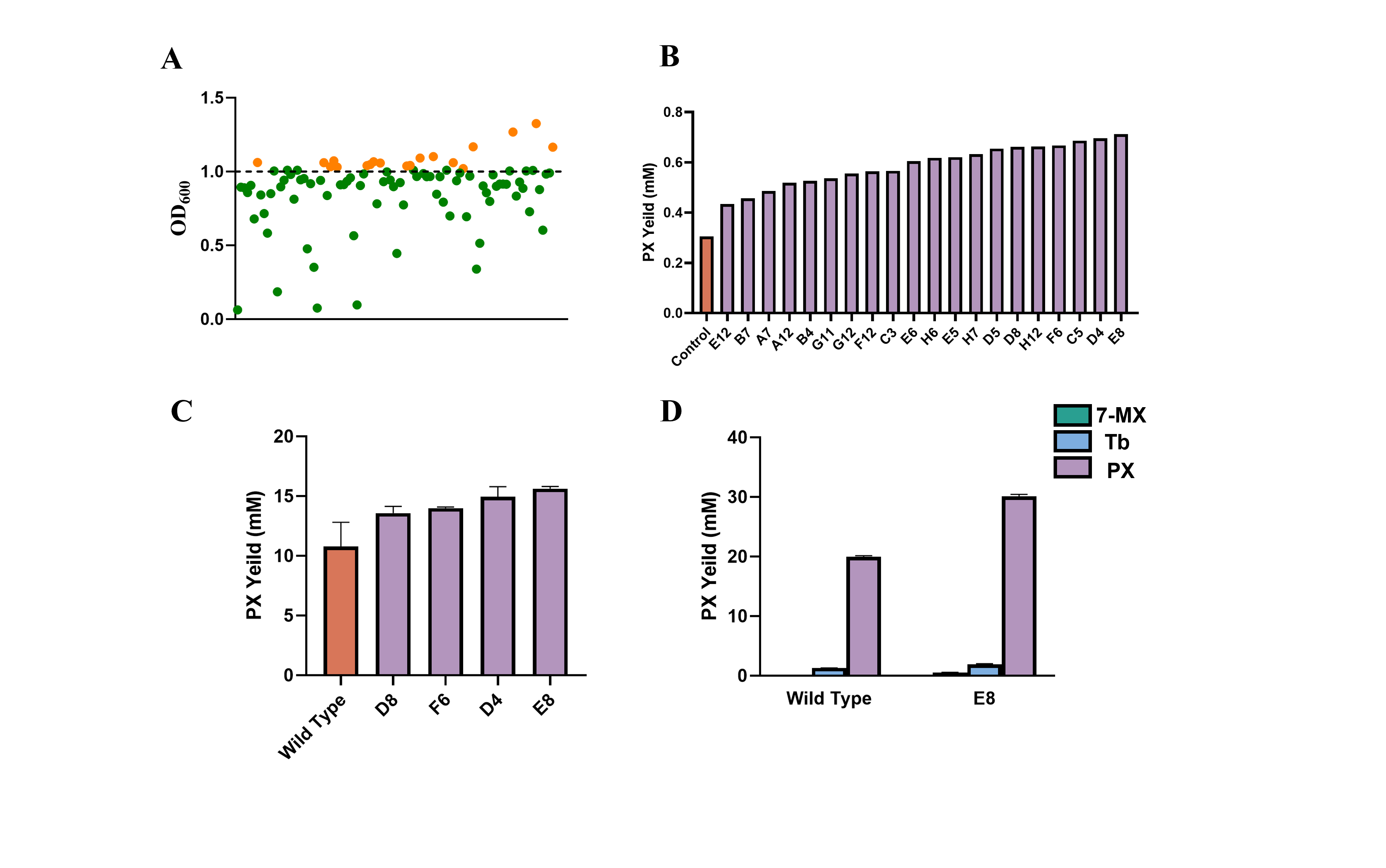 Figure 10. Promoter -10 region mutant screening and PX yield analysis. (A) Screening results of the promoter -10 region mutants. The orange bars indicate strains with OD600 values higher than 1.0. Due to using NdmBQ289T as a template, the overall OD600 values were generally higher during the screening. (B) Twenty strains with OD600 values greater than 1.0 were selected, and their PX yields were measured using HPLC. (C) Further large-scale culture experiments were conducted on four outstanding mutants (D8, F6, D4, E8). Under conditions with OD600 of 100 and a substrate concentration of 20 mM, the PX yield of E8 reached 15.62 ± 0.13 mM, representing an approximately 45% increase compared to the original NdmBQ289T. (D) Under conditions with OD600 of 200 and a substrate concentration of 40 mM, the PX yield of the E8 strain further increased to 30.11 ± 0.23 mM, a 50% improvement over the original NdmBQ289T.