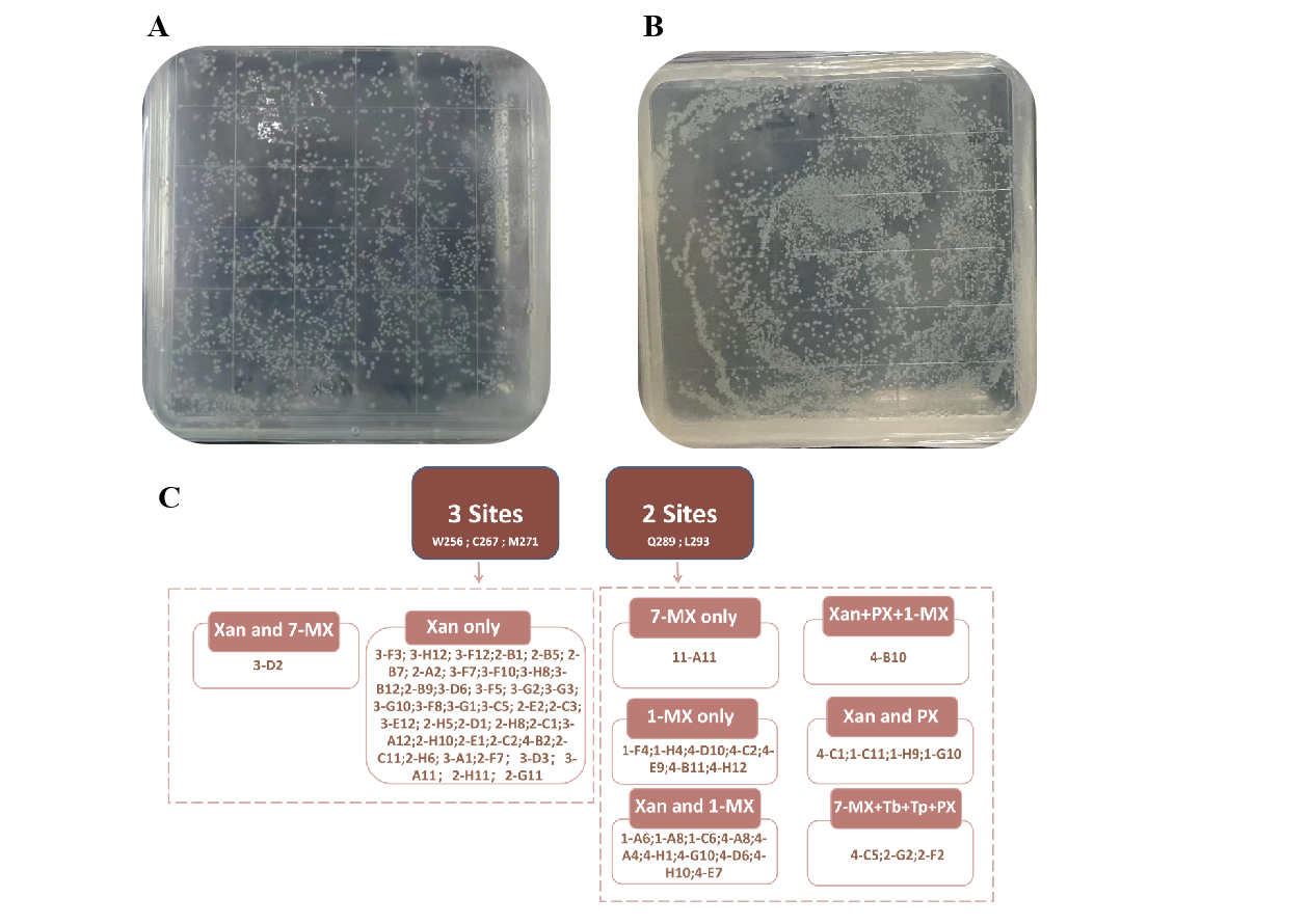Figure 2. NdmB combinatorial mutations. (A) Mutations at positions Q289 and L293. (B) Mutations at positions W256, C267, and M271. (C) This figure summarizes the mutation types and their corresponding products. Strains with higher OD600 values produce not only hypoxanthine but also other methylxanthine compounds (e.g., 1-MX and 7-MX). Among the mutants, those that directly produce xanthine constitute the majority.