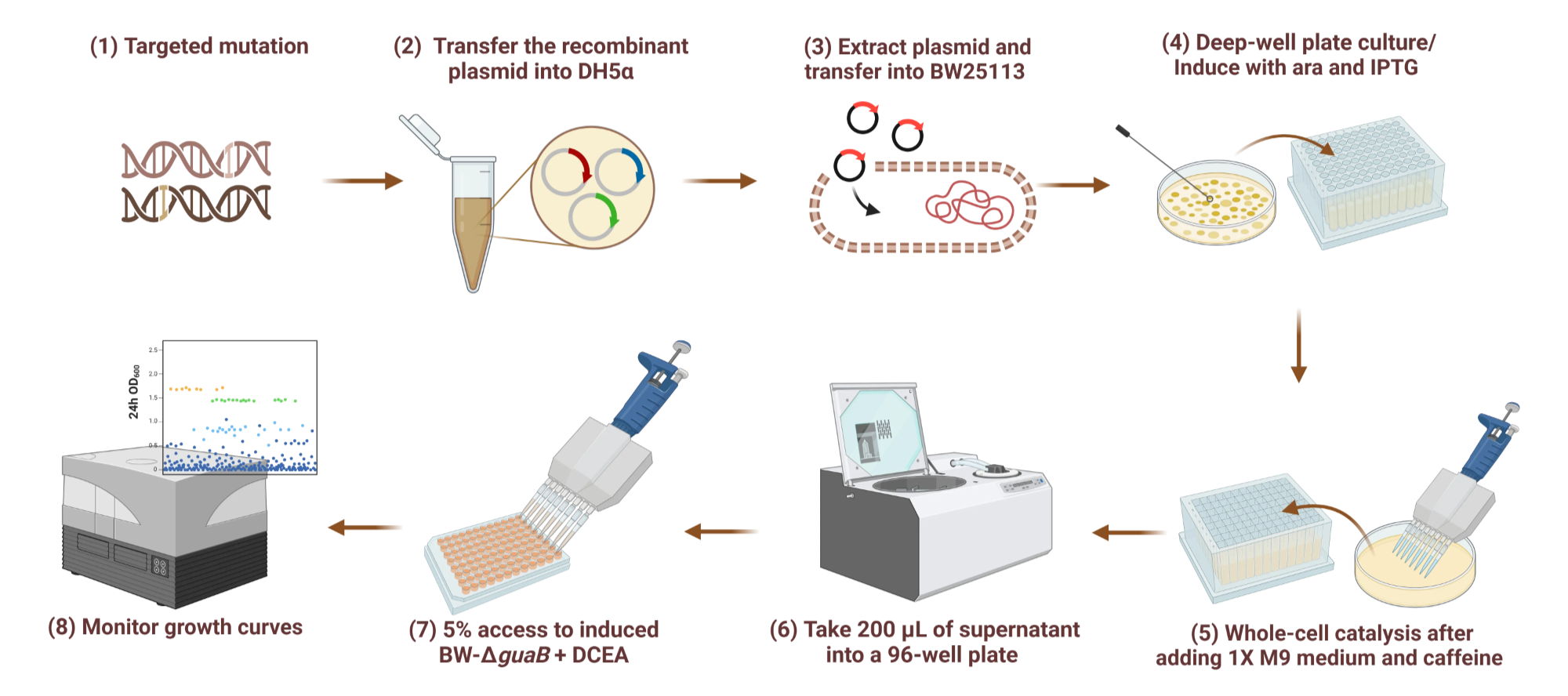 Figure 3. Schematic diagram of the directed evolution and mutant screening process for NdmB.The process includes: (1) Site-directed mutagenesis of key residues in NdmB using degenerate primers; (2) Transformation of recombinant plasmids into E. coli DH5α competent cells for amplification; (3) Plasmid extraction and transformation into the E. coli BW25113 strain; (4) Induction of mutant NdmB expression in deep-well plates containing arabinose and IPTG; (5) Addition of 1 × M9 medium and caffeine for whole-cell catalysis; (6) Collection of the supernatant by centrifugation, transfer to a 96-well plate; (7) Addition of the whole-cell biosensor; (8) Monitoring of bacterial growth curves to evaluate the catalytic efficiency of each mutant in producing PX.