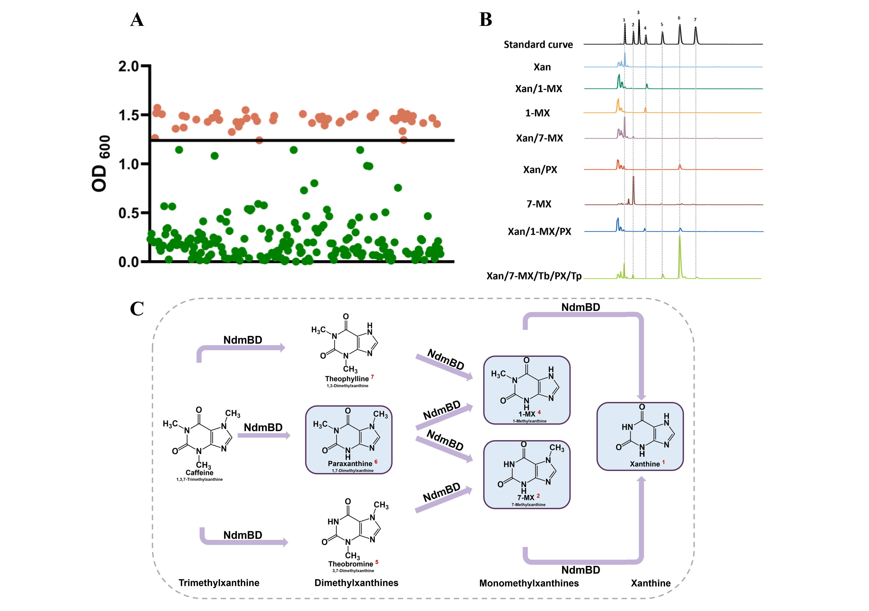 Figure 4. Screening results and by-product analysis of NdmB mutants.(A) Screening results of mutants using the PX whole-cell biosensor. The figure highlights positive clones with higher OD600 values (in orange), indicating that these strains likely have a stronger capability for PX production. (B and C) HPLC analysis of the standard curves for products from different strains. The analysis confirmed that the mutants produced not only PX but also other demethylated by-products, such as 1-MX and 7-MX.