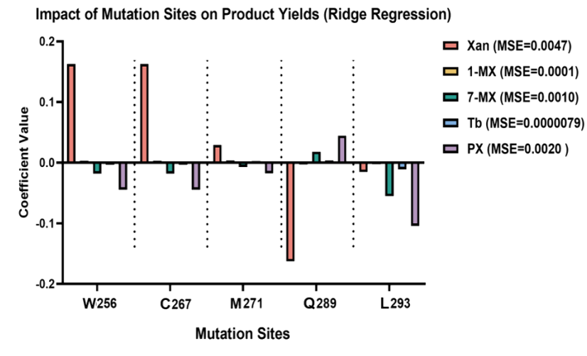 Figure 5. The Ridge regression model analyzed the influence of five mutation sites (W256, C267, M271, Q289, L293) on the generation of different products. Positive regression coefficients indicated that the mutations had a favorable effect on methylxanthine production, with Q289 mutations significantly enhancing the production of PX and 7-MX, while other sites tended to promote the formation of different demethylated products.