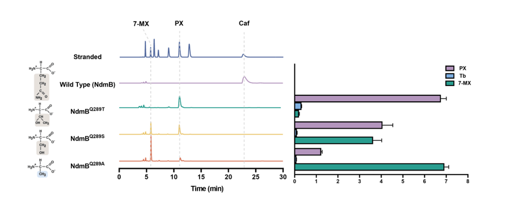 Figure 6. HPLC analysis of catalytic products from NdmB mutants. The NdmBQ289T mutant exhibited a significant increase in PX production, while the NdmBQ289A mutant showed a preference for producing 7-MX. Larger R-groups (such as threonine) favor PX production, while smaller R-groups (such as alanine) tend to generate 7-MX.
