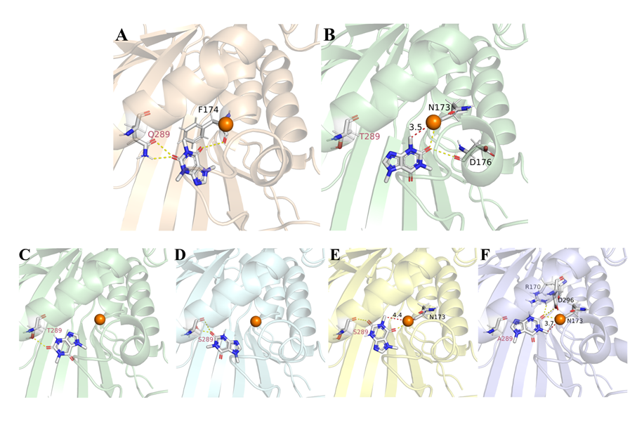 Figure 7. Molecular docking analysis of NdmB mutants with substrates. (A) Docking analysis of wild-type NdmB with caffeine, showing that the key residue NdmBQ289T blocks caffeine from entering the active pocket. (B) Docking analysis of NdmBQ289T with caffeine indicates that reduced steric hindrance allows the N3 methyl group of caffeine to approach the active center at a distance of 3.5 Å. (C) Docking analysis of NdmBQ289T with PX reveals that the absence of the N3 methyl group exposes a carbonyl group that interacts with the Thr residue, which prevents further demethylation. (D and E) Docking analysis of NdmBQ289S with PX demonstrates steric effects from the Ser side chain,partially converting PX to 7-MX. (F) Docking analysis of NdmBQ289A with PX indicates that lack of A289 interaction with PX allows the N1 methyl group to approach the active center, leading to increased production of 7-MX.