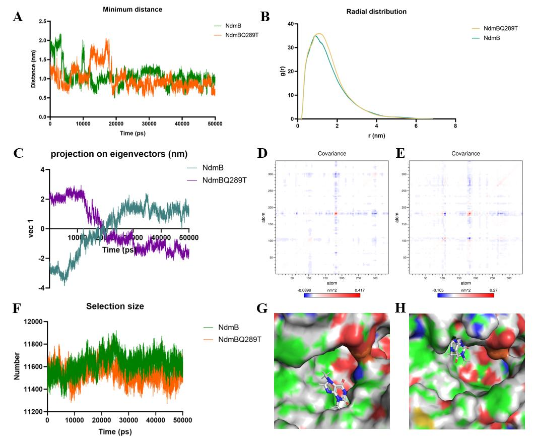 Figure 8. Analysis of caffeine binding in wild-type NdmB and mutant NdmBQ289T. (A) Analysis of the distance between the N3-methyl group and non-heme iron. (B) Radial distribution function (RDF) analysis: the RDF profiles of the wild-type and mutant are generally similar. (C) Principal component analysis (PCA) projection of feature vectors. (D) Covariance analysis of wild-type NdmB. (E) Covariance analysis of the mutant: in comparison, the mutant shows more concentrated positive covariance, and the areas of negative covariance in NdmBQ289T are reduced, indicating that atomic movement is more consistent and coordinated throughout the simulation, potentially contributing to increased structural stability. (F) Analysis of atoms near caffeine. (G) Visualization of the binding pocket in wild-type NdmB. (H) Visualization of the binding pocket in NdmBQ289T.