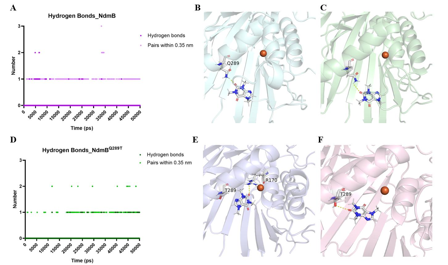 The polar repulsion and hydrogen bond interactions between NdmB and the structure of methylxanthine together regulate the positioning of the substrate at the enzyme's active site. We further conducted a hydrogen bond analysis of wild-type NdmB and the mutant NdmBQ289T. The results showed that hydrogen bonds in wild-type NdmB primarily formed between 5000–7500 ps and 8500–10000 ps (Figure 9A). During the first 10000 ps, the amino hydrogen on the R-group of NdmBQ289T formed hydrogen bonds multiple times with the carbonyl group of caffeine, and the carbonyl groups frequently generated repulsive forces, preventing caffeine from approaching the active site (Figure 9B). Since caffeine could not reach the active site, it shifted in another direction and eventually bound to a nearby pocket region (5568 ps), where it stabilized. However, this pocket was separated from the non-heme iron in the active center by other amino acid residues, making it difficult for caffeine to contact the non-heme iron at this location (Figure 9C). In contrast, hydrogen bonds in the mutant NdmBQ289T were easily stabilized after 40000 ps (Figure 9D). NdmBQ289T rarely formed hydrogen bonds with caffeine, and the spatial hindrance was minimal, allowing caffeine to enter the pocket smoothly and approach the active site near the non-heme iron. Once caffeine entered the active site, the amino hydrogen on residue R170 formed hydrogen bonds with caffeine's carbonyl group, preventing it from moving away from the non-heme iron (Figure 9E). Besides not obstructing caffeine from entering the pocket, NdmBQ289T could also generate repulsive forces when caffeine attempted to leave the pocket, thereby hindering its exit (Figure 9F).