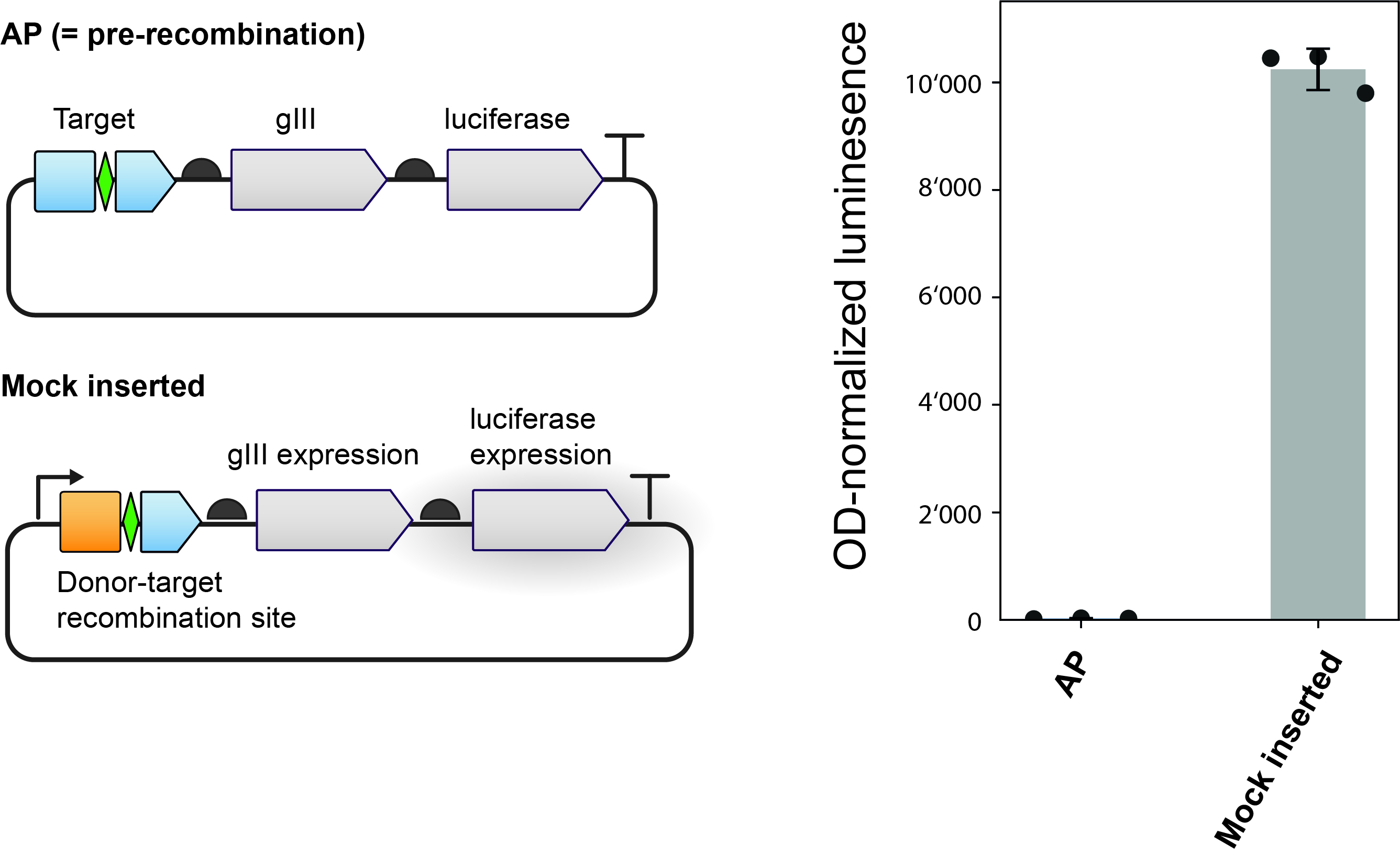 To quantify the transcriptional gain produced by promoter repositioning and to validate that the post-recombination state strongly expresses gIII, we designed a mock-integrated plasmid that mimics the recombination product: the promoter is pre-installed upstream of gIII. On the same transcript downstream of gIII, a luciferase is expressed to enable a luminescent readout proportional to transcription through the gIII–lux cassette. When comparing strains carrying the pre-recombination configuration versus the mock-integrated (post-recombination) construct, we observed a ~10,000-fold (four-orders-of-magnitude) increase in luminescence for the mock-integrated state (Figure3), indicating a working transcription unit upon site-specific insertion.
