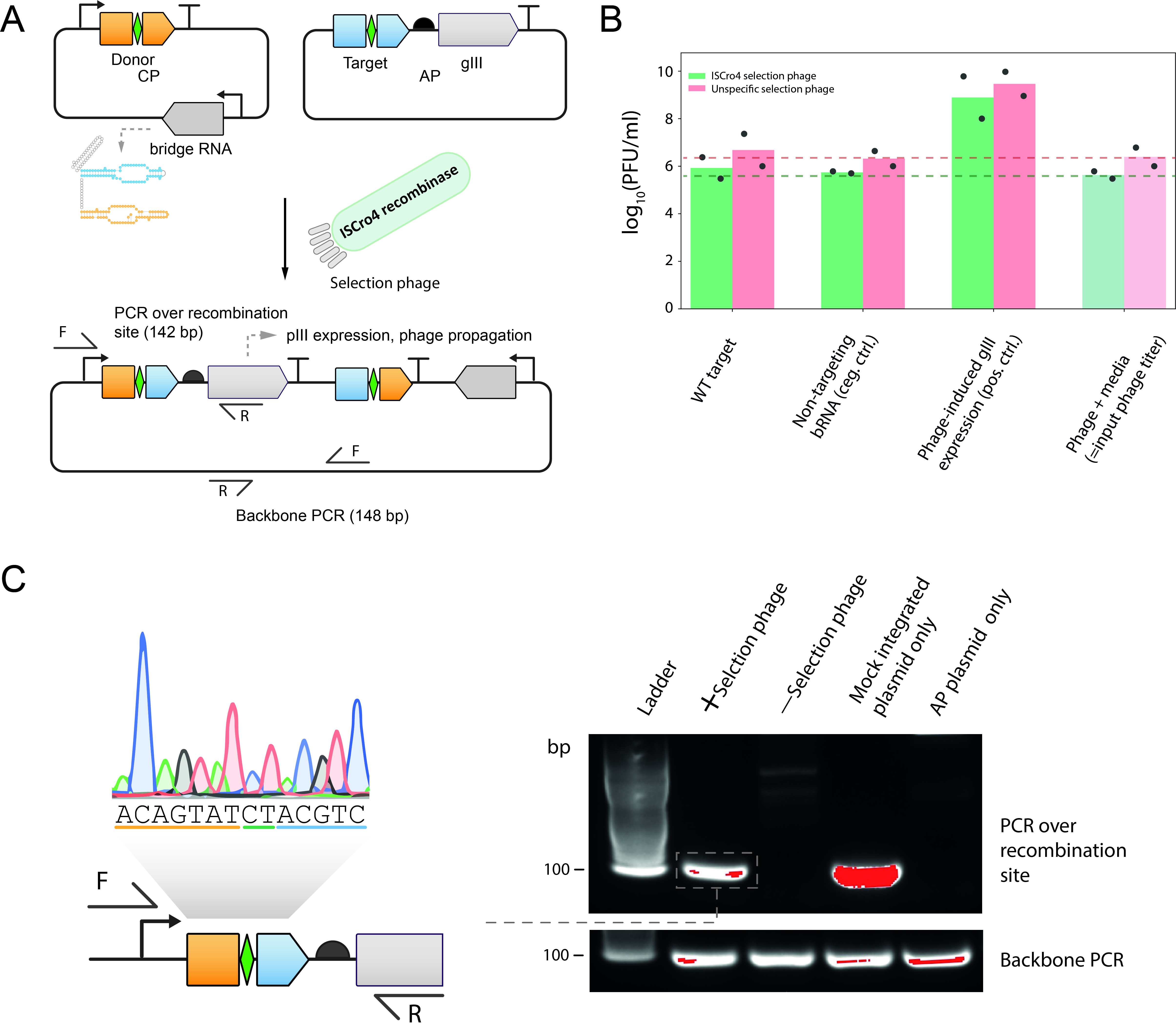Having established activity and a transcriptional readout, we next asked whether the full selection logic supports phage propagation. We infected E. coli carrying the AP and CP with the ISCro4 selection phage (SP–ISCro4) and incubated cultures overnight (Figure4A). As an initial test, we used WT ISCro4 with its cognate bRNA and quantified titres the following day. Under these conditions, no significant titre increase was observed relative to input phage titre and negative controls (non-targeting bRNA) (Figure4B). Nonetheless, junction-specific PCR spanning the donor–target recombination site yielded the expected product, confirming that recombination occurred despite the lack of phage amplification (Figure4C).