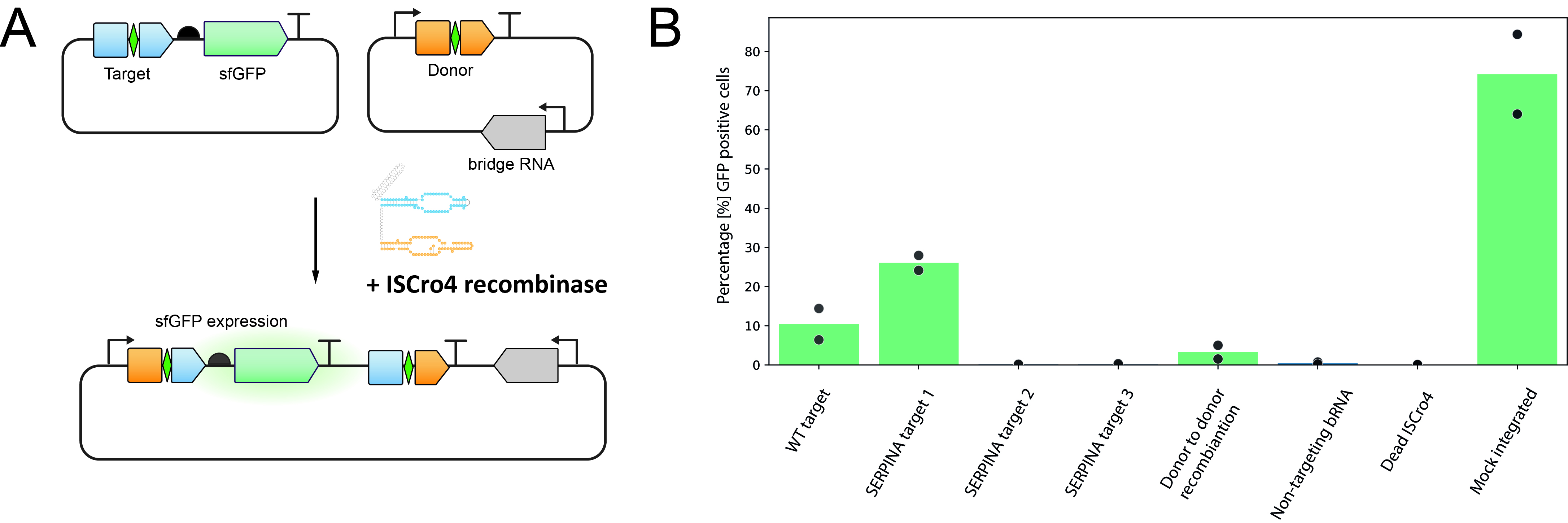 Although ISCro4 is highly active in human cells, its activity in E. coli has not been documented. To test whether ISCro4 can catalyse promoter-repositioning insertions (modelling the insertion needed to restore a healthy SERPINA1 copy) in bacteria when paired with designed bRNAs, we constructed an sfGFP reporter that mirrors the PACE selection logic (Figure2A). In this system, sfGFP is carried on a low-copy plasmid with the recombination target site (either ISCro4 WT target, SERPINA1 target 1-3 or ISCro4 WT donor sequence) upstream and no promoter - analogous to gIII on the AP - and is co-transformed with a CP encoding the bRNA and a promoter–donor cassette, together with an arabinose-inducible ISCro4 expression plasmid.