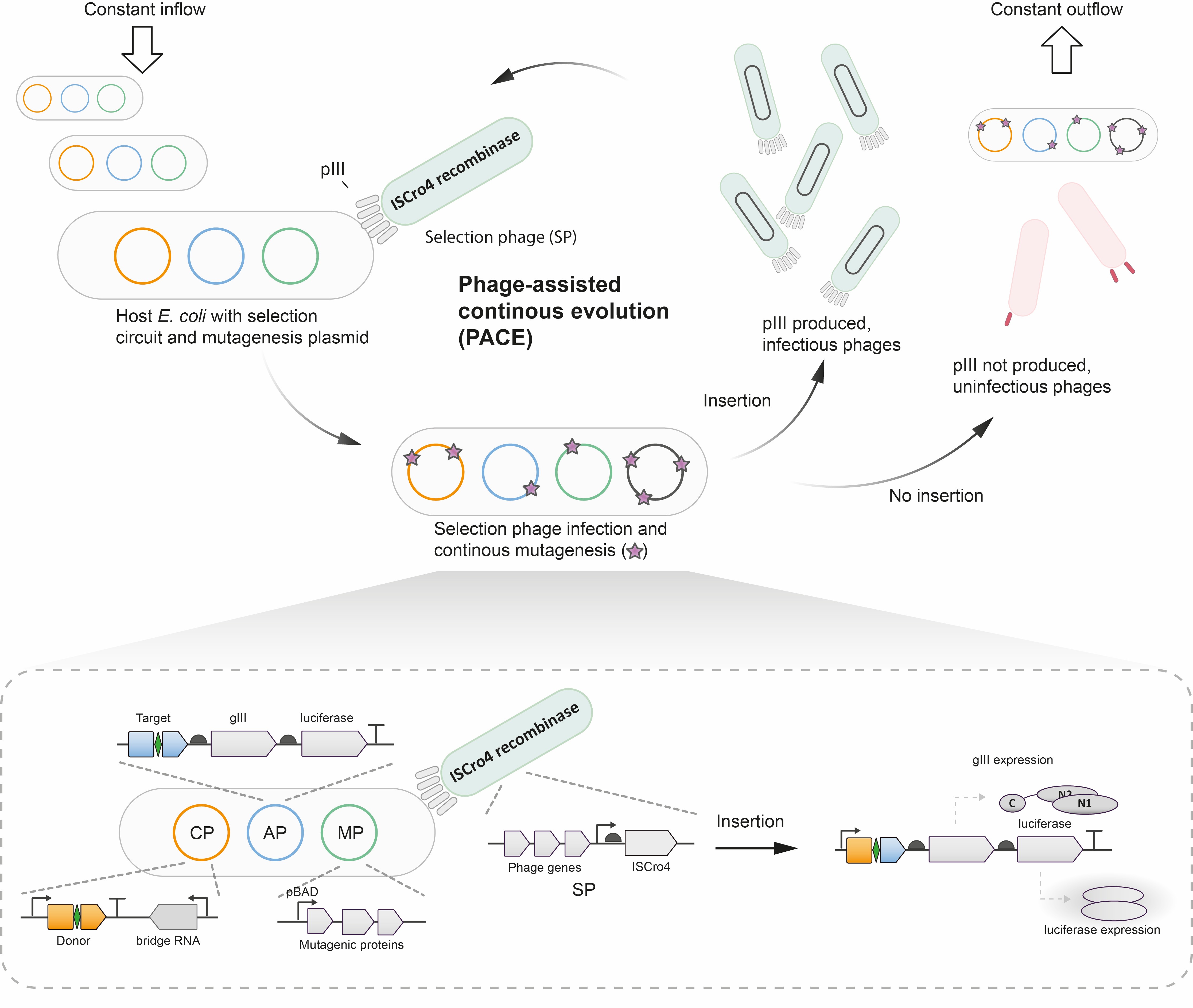 Here we outline the rationale, design and preliminary testing of a insertion based phage-assisted continuous evolutions (PACE) 1 logic for evolving bridge recombinases on the example of the ISCro4 bridge recombinase.