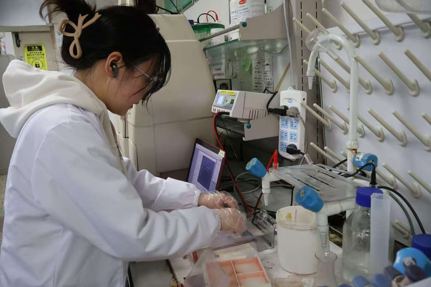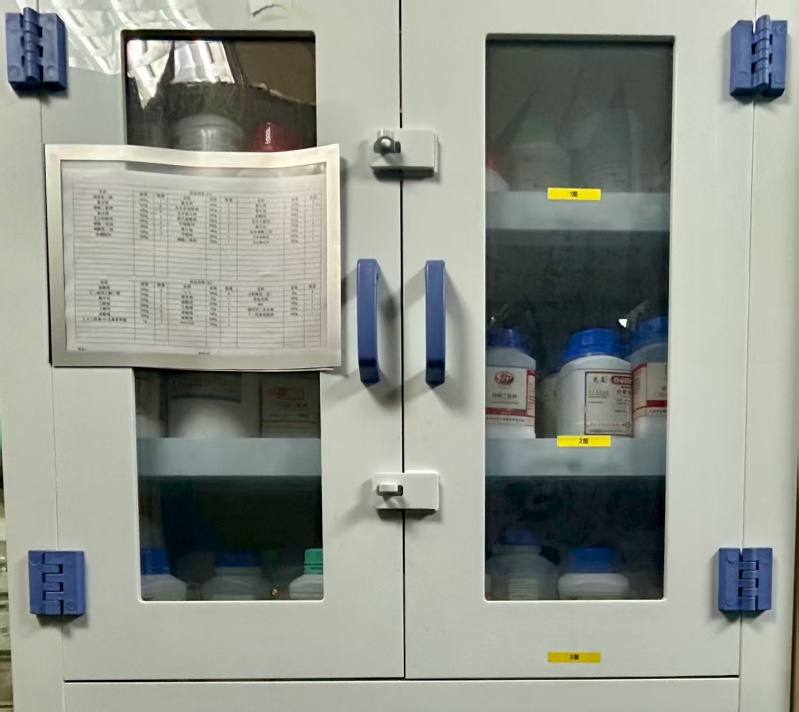 All chemicals used in the experiments are securely stored in dedicated medical cabinets and categorized based on their types with appropriate labeling to enhance safety warnings and selection accuracy. The laboratory also conducts regular inspections to ensure the quality and safety of these chemicals.