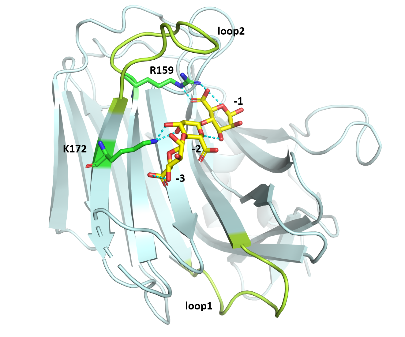 K172 forms hydrogen bonds with the hydroxyl groups at the C-2 and C-3 positions of the sugar at the −2 subsite, thereby helping to precisely anchor the substrate.