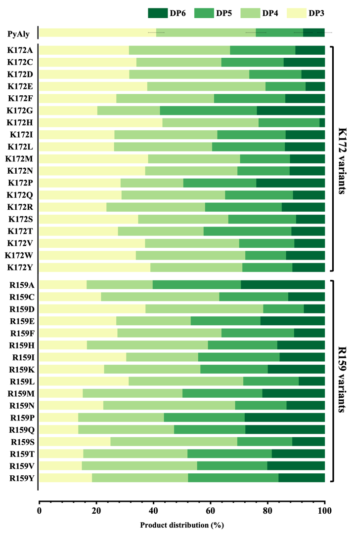 Compared with the wild type PyAly, different mutants exhibited distinct product distributions. The tetrasaccharide proportion in the wild type was around 34.5%. At the K172 position, several mutants showed increased tetrasaccharide production, with K172D and K172E reaching the highest proportions of 42.1% and 41.4%, respectively, while K172W and K172Q also displayed elevated levels ranging from 36.3% to 38.4%.