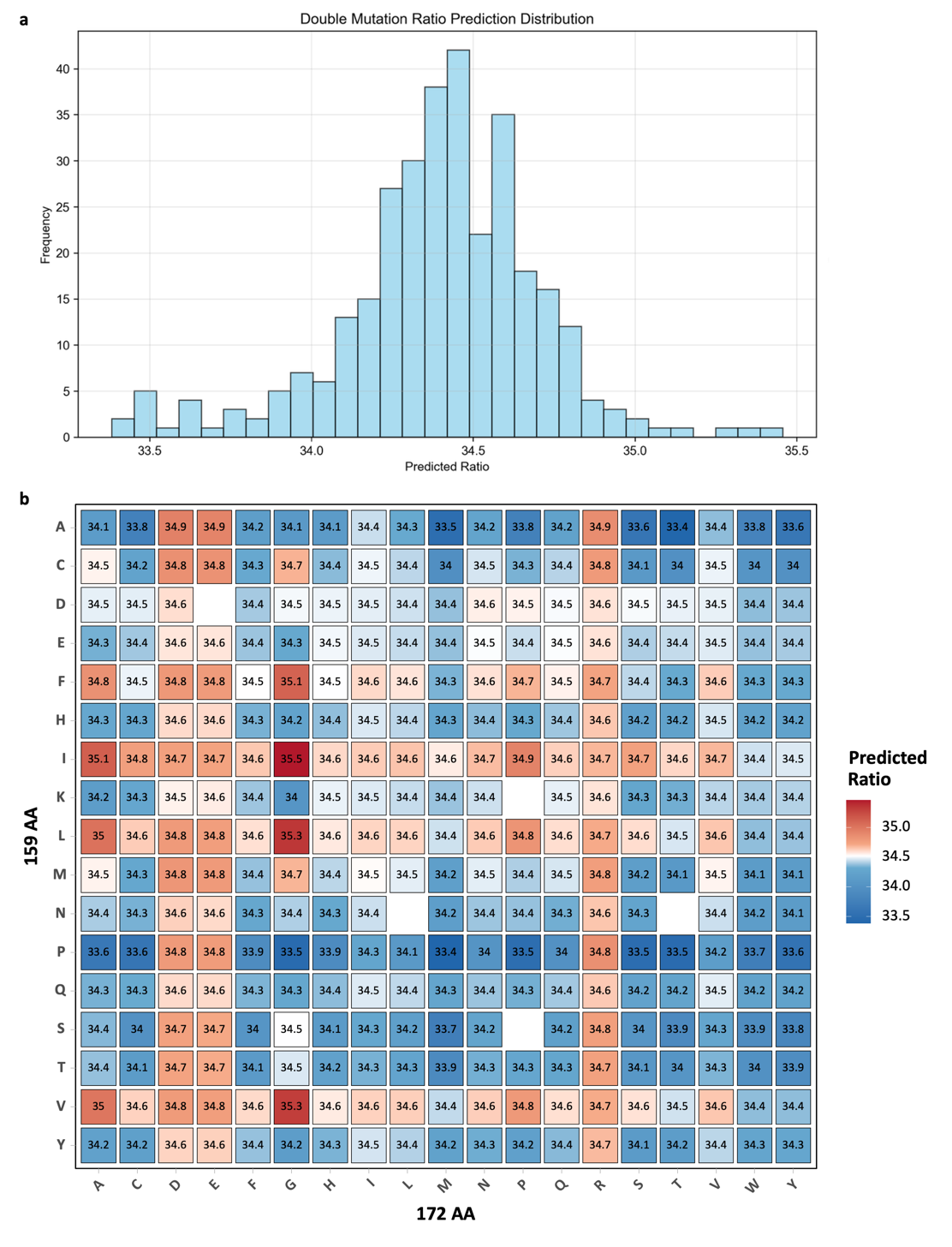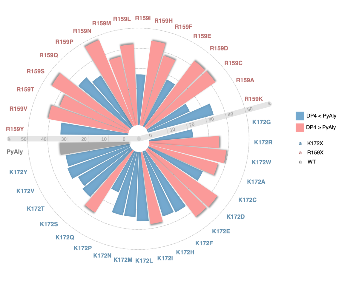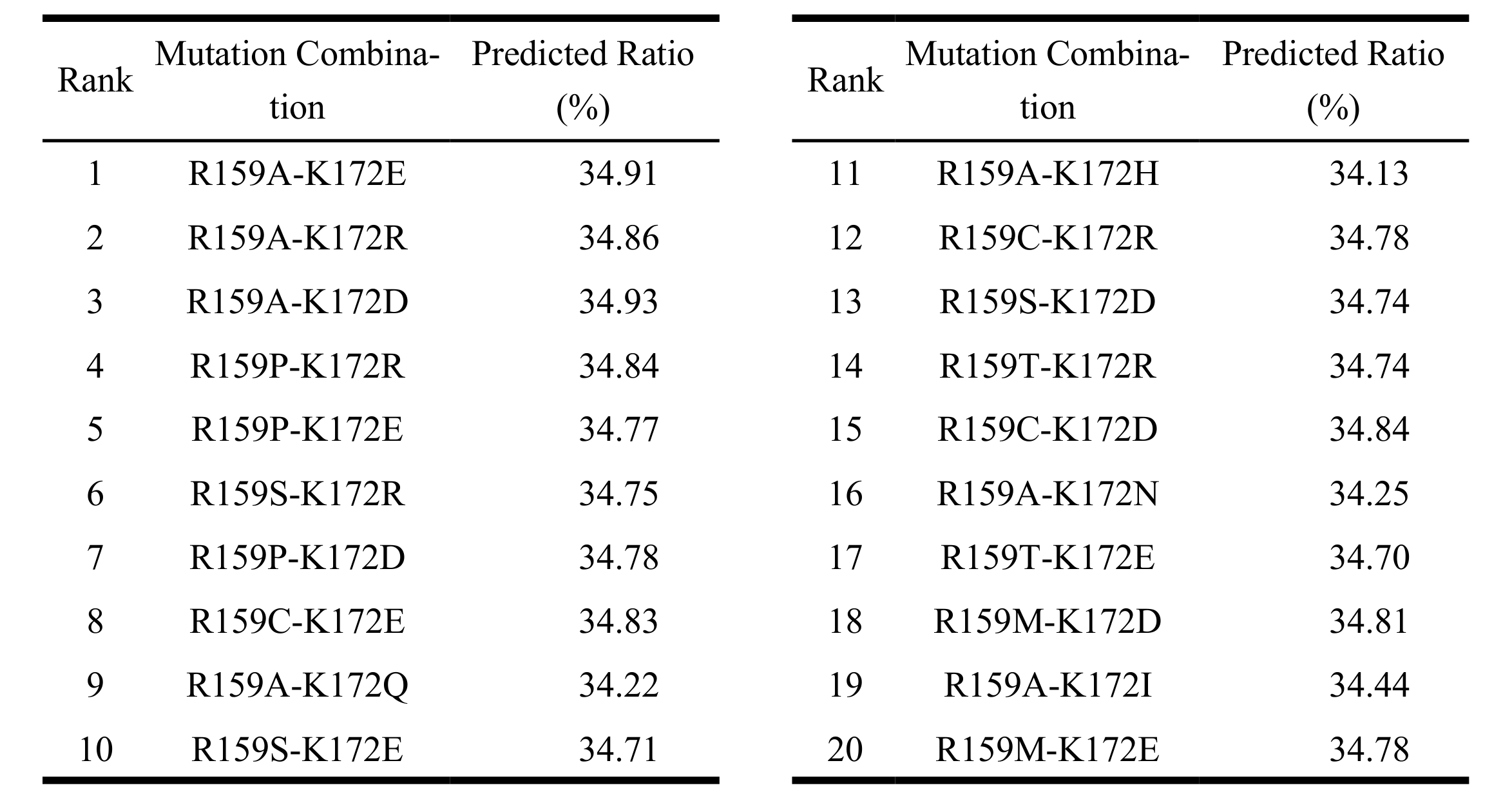Among all candidates, the top twenty double-site mutants were predicted to achieve DP4 ratios ranging from 34.13% to 34.93%, mostly surpassing the wild-type PyAly (34.52%) (Table 1). The highest-ranked predicted combination was R159A-K172E, with a DP4 ratio of 34.91% and a Combined Score of 0.9882. Other top-performing predicted variants included R159A-K172R (34.86%, 0.9863) and R159A-K172D (34.93%, 0.9854). Variants with R159A/P substitutions paired with K172E/R/D consistently enhanced DP4 selectivity. Slightly lower-ranked variants (Combined Score ~0.973–0.979), such as R159A-K172H (34.13%, 0.9776) and R159C-K172R (34.78%, 0.9775), maintained DP4 ratios above 34.1%.