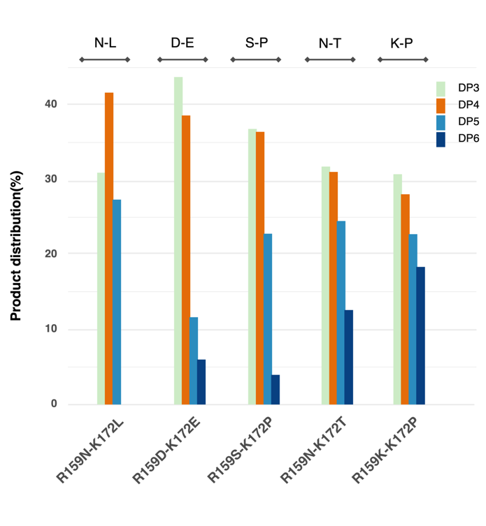 In summary, these results demonstrate that single-site mutations at different positions have distinct impacts on product distribution. Both the R159 and K172 series contain multiple “positive mutations” that increase tetra-saccharide proportion.