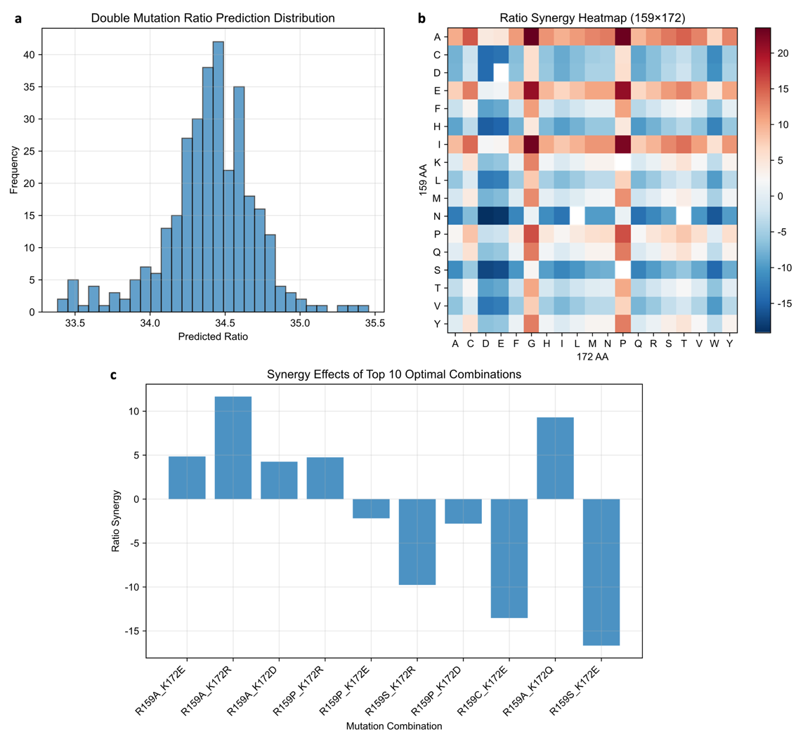 To investigate the combinatorial effects of R159 and K172 mutations, an esemble of machine-learning models—including SVR, MLP, GPR, and kernel-ridge regression—was used to exhaustively predict the performance of all 318 theoretical double-site variants (Figure 6). Both DP4 proportion and peak area were evaluated, and an integrated Combined Score was calculated to rank overall performance.