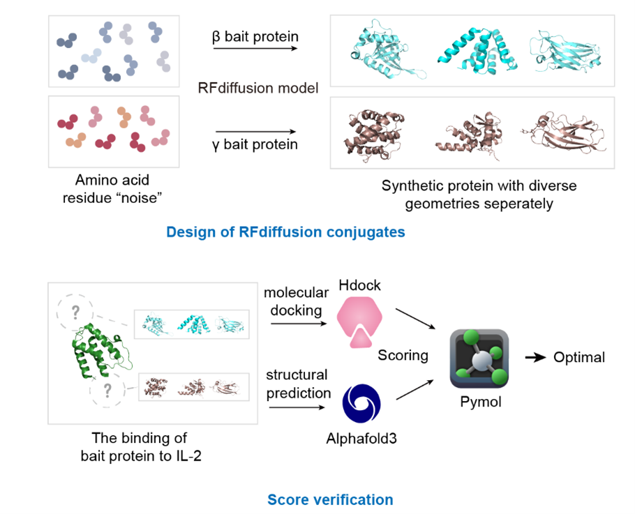 De novo protein design refers to the from-scratch computational generation of protein sequences and structures without relying on naturally occurring templates. It leverages physics-based modeling, energy minimization, and increasingly deep learning algorithms to predict stable folds and desired functions. Representative methods include Rosetta de novo modeling, AlphaFold/AlphaFold3 for structure prediction, and generative models such as ProteinMPNN, RFdiffusion, and EvoDiff. In our project, we designed two distinct libraries of 100 sequences each targeting IL-2Rβ and IL-2Rγ via RFdiffusion. Following the initial HDOCK screening to exclude sequences with high affinity for IL-2Rα, we combinatorially assembled the selected β and γ peptides and then proceeded with structural prediction via AlphaFold3 and experimental validation.