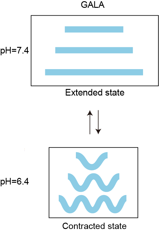 The GALA peptide (WEALLAEALAEALAEHLAEALAEALEALAA) is a rationally designed pH-sensitive sequence. At physiological pH (7.4), the repetitive glutamic acid side-chain carboxyl groups remain negatively charged, and electrostatic repulsion drives the peptide to adopt a random coil conformation. When the pH decreases to 6.4, protonation of the glutamic acid residues reduces electrostatic repulsion, thereby enabling the peptide chain to fold into a rigid α-helical structure. To construct an acid-responsive IL-2R agonist, we incorporated the GALA peptide into the IL-2 mimic.