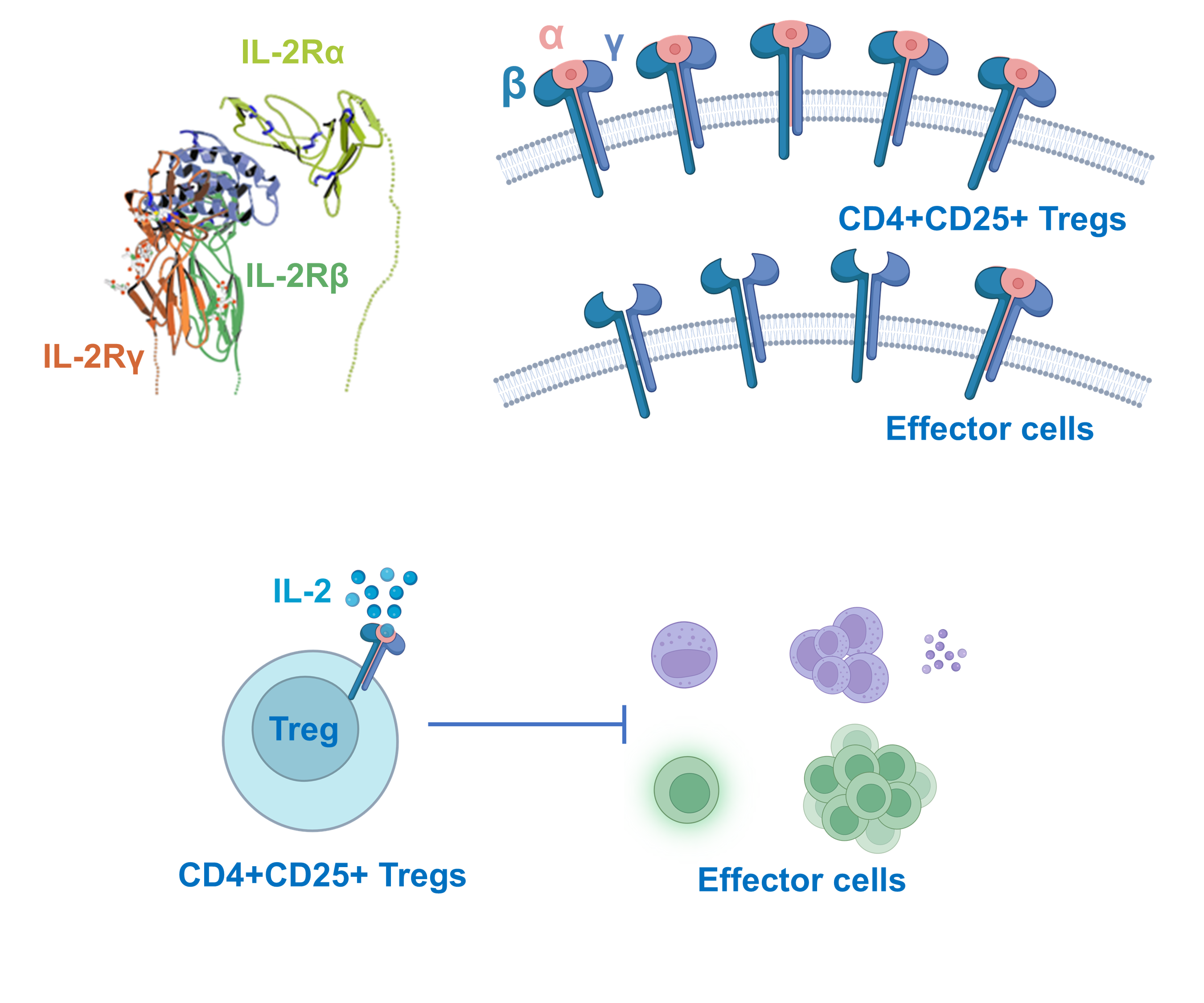 The IL-2 receptor consists of three subunits: IL-2Rα (CD25), IL-2Rβ (CD122), and IL-2Rγ (CD132). Signaling initiation requires a dimeric complex of IL-2Rβ and IL-2Rγ. The incorporation of IL-2Rα into this complex, together with the β and γ chains, forms the high-affinity IL-2R, substantially enhancing IL-2 binding. As a key component of this receptor, CD25 is highly expressed on CD4+CD25+ regulatory T cells (Tregs), enabling their responsiveness to IL-2 and facilitating antigen-nonspecific suppression of effector T cells. Consequently, there is significant interest in developing engineered IL-2 variants that avoid binding to the α-subunit while maintaining affinity for the β and γ subunits. Such variants hold promise for reducing CD25-mediated immunosuppression while preserving the core immunomodulatory functions of IL-2.