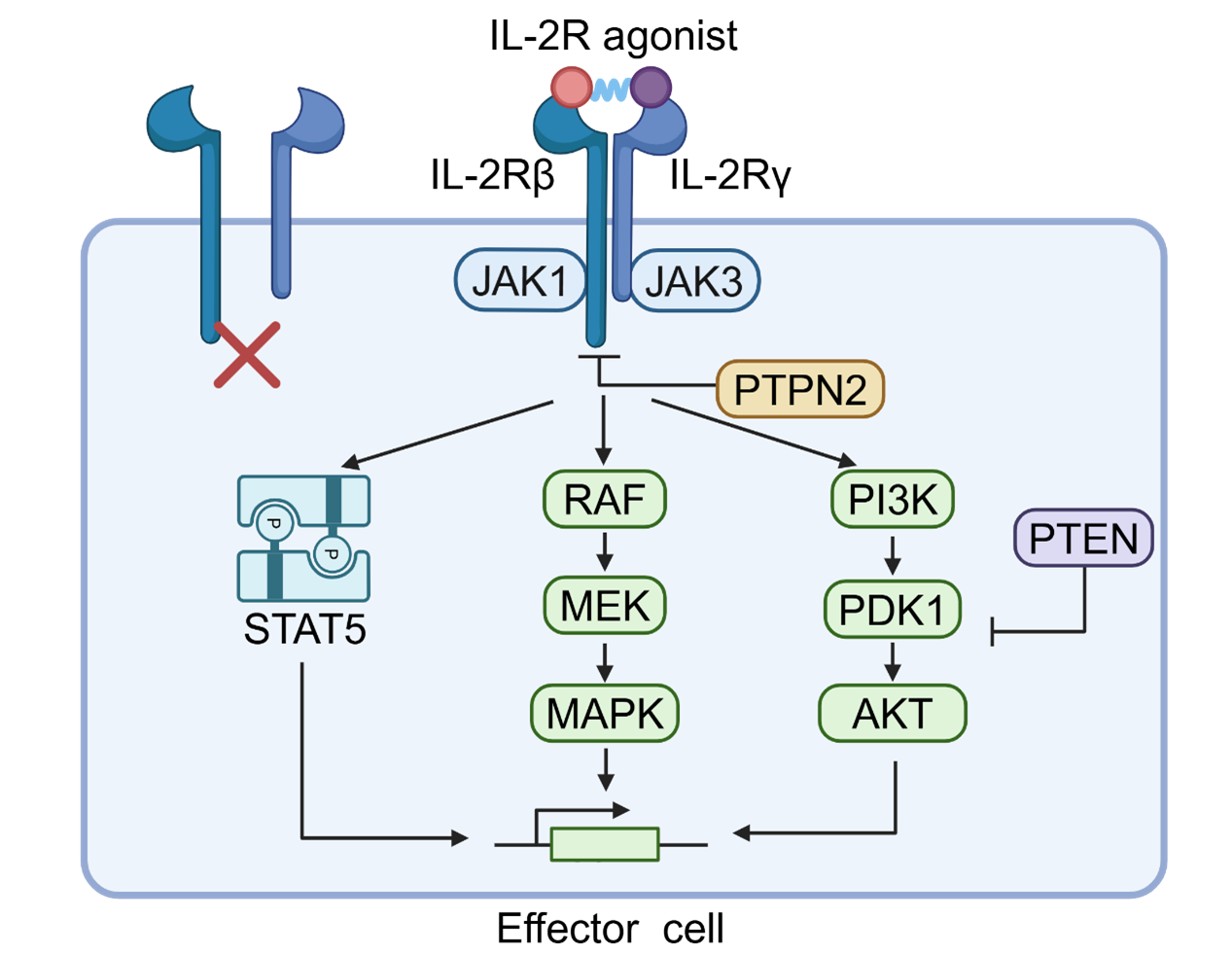 Interleukin-2 (IL-2) initiates downstream signaling by binding to the IL-2 receptor (IL-2R), which requires oligomerization of the β chain (IL-2Rβ) and γ chain (IL-2Rγ) to form a stable receptor complex. This oligomerization is critical for the recruitment and activation of intracellular signaling molecules. Upon complex formation, JAK1 and JAK3 are phosphorylated, thereby activating the JAK-STAT pathway, in which phosphorylated STAT5 dimerizes and translocates to the nucleus to regulate transcriptional programs that promote cell proliferation, survival and effector molecule production. Concurrently, the PI3K-AKT pathway is engaged through PI3K recruitment, leading to PIP3 generation and AKT activation, which enhances cell survival, metabolism, and anti-apoptotic signaling.
