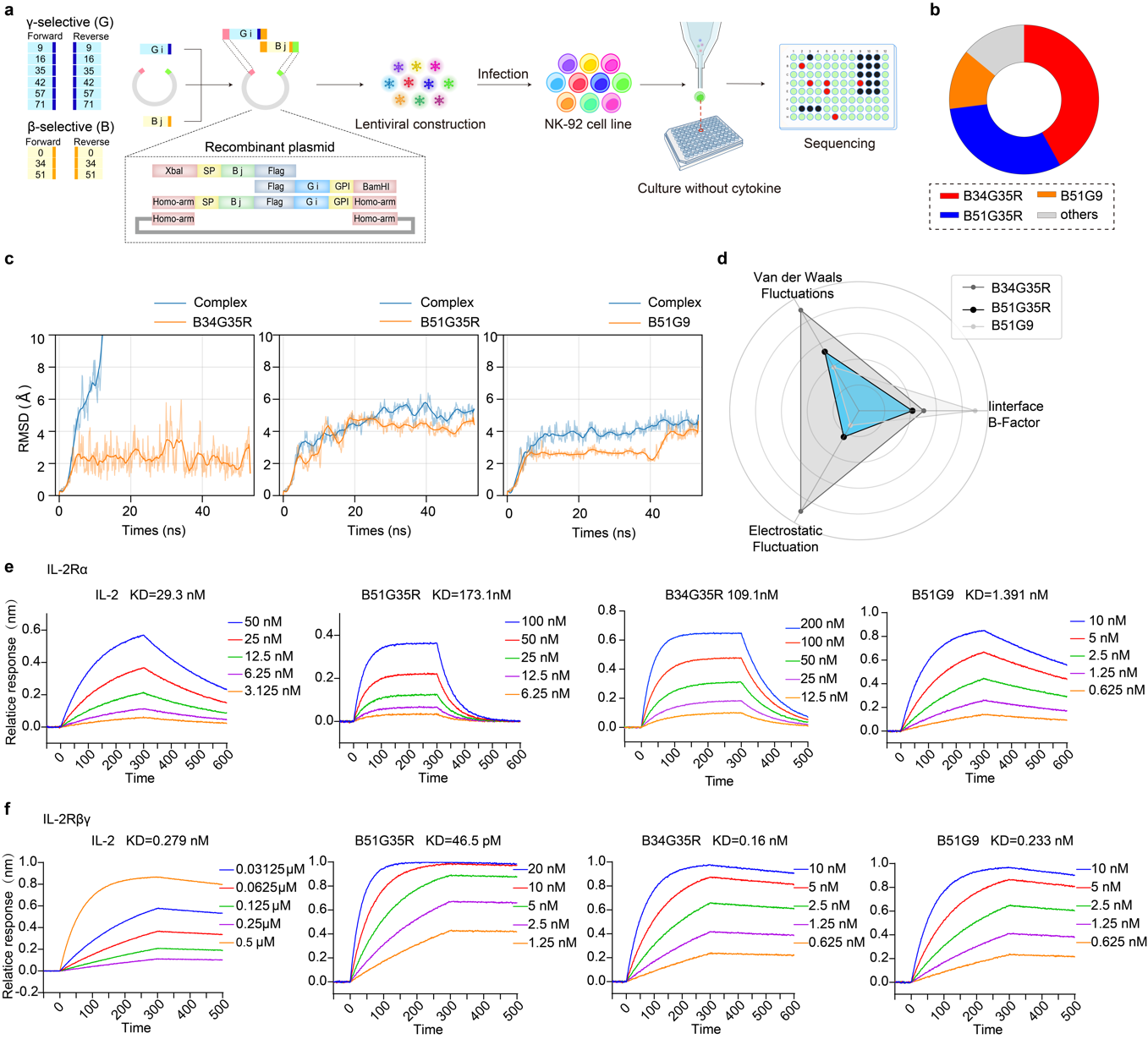 G9, G16, G35, G42, G57, and G71, together with their reverse counterparts, were conjugated via a flexible linker and fused with a glycosylphosphatidylinositol (GPI) anchor to retain IL-2 mimics on the cell surface, while incorporation of a Flag tag enabled subsequent detection and isolation, collectively facilitating NK cell activation (Fig. 2a) Lentiviral transduction of NK-92 cells generated a library of 36 variants, each expressing a distinct IL-2 mimic. To identify the specific sequences that promote NK cell proliferation, the library was seeded into 96-well plates at one cell per well and cultured under cytokine-free conditions. Expanded clones were subsequently harvested and subjected to sequencing (Fig. 2a), which revealed significant enrichment of B34G35R, B51G35R, and B51G9 compared with other constructs (Fig. 2b).