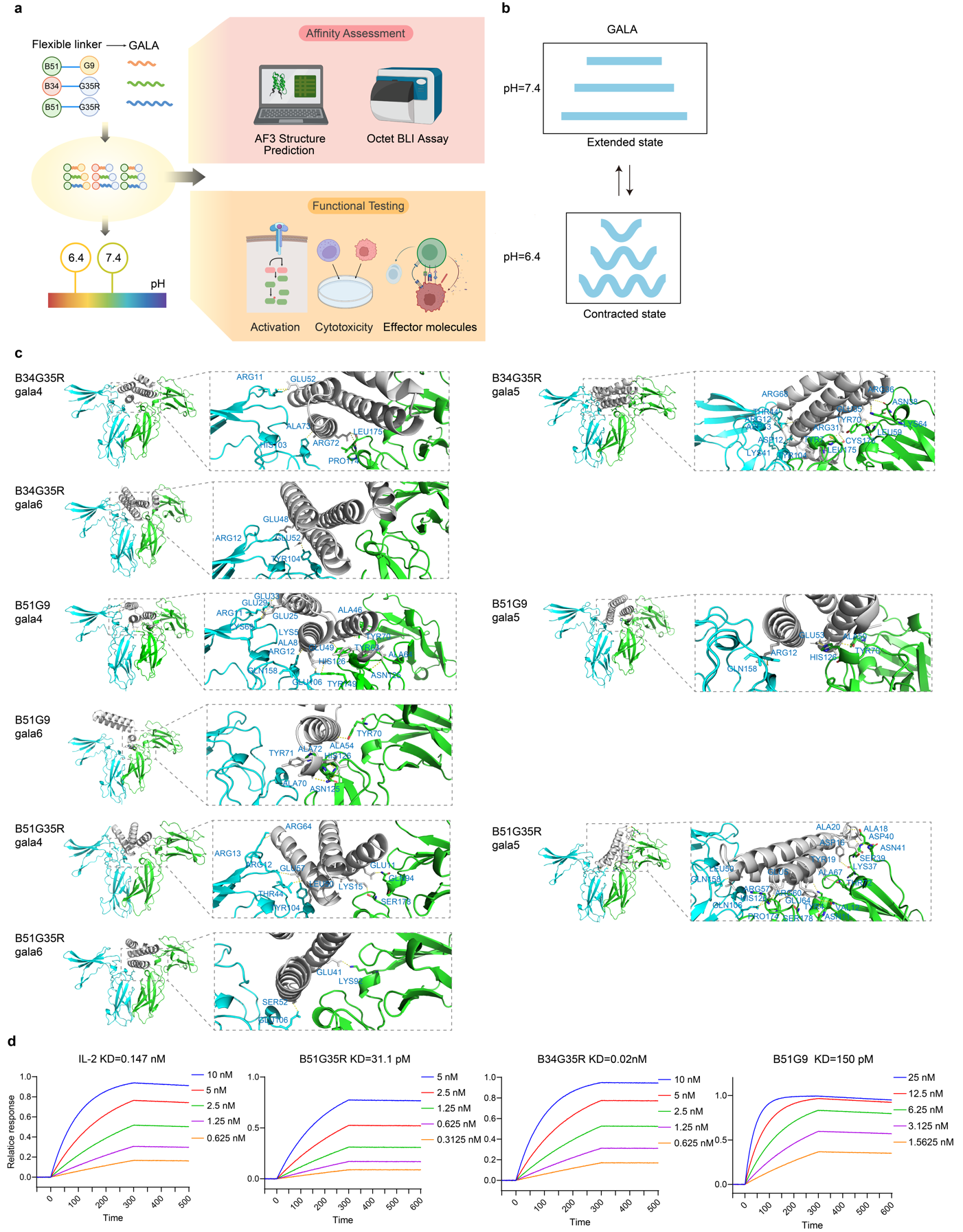 Fig. 4 | GALA replacement and detection of binding affinity under acidic condition. a, Schematic overview of the replacement of GALA, affinity assessment through AF3 structure prediction and BLI assay, and functional testing including activation, cytotoxicity and effector molecules of the designed mimics with where the flexible GGGGS peptide was substituted with GALA4, GALA 5, GALA 6 (4, 5, and 6 represent the number of EALA repeat units in the GALA peptide). b, General depiction of the conformational transition of GALA between extended state at pH=7.4 and contracted state at pH=6.4. c, The front view of the binding sites between B34G35R-G, B51G35R-G, and B51G9-G with IL-2Rβγ, with the box zooming in to show the amino acids at the binding site (stick representation). d, BLI characterization of the binding of B34G35R-G, B51G35R-G, and B51G9-G to IL-2Rβγ.