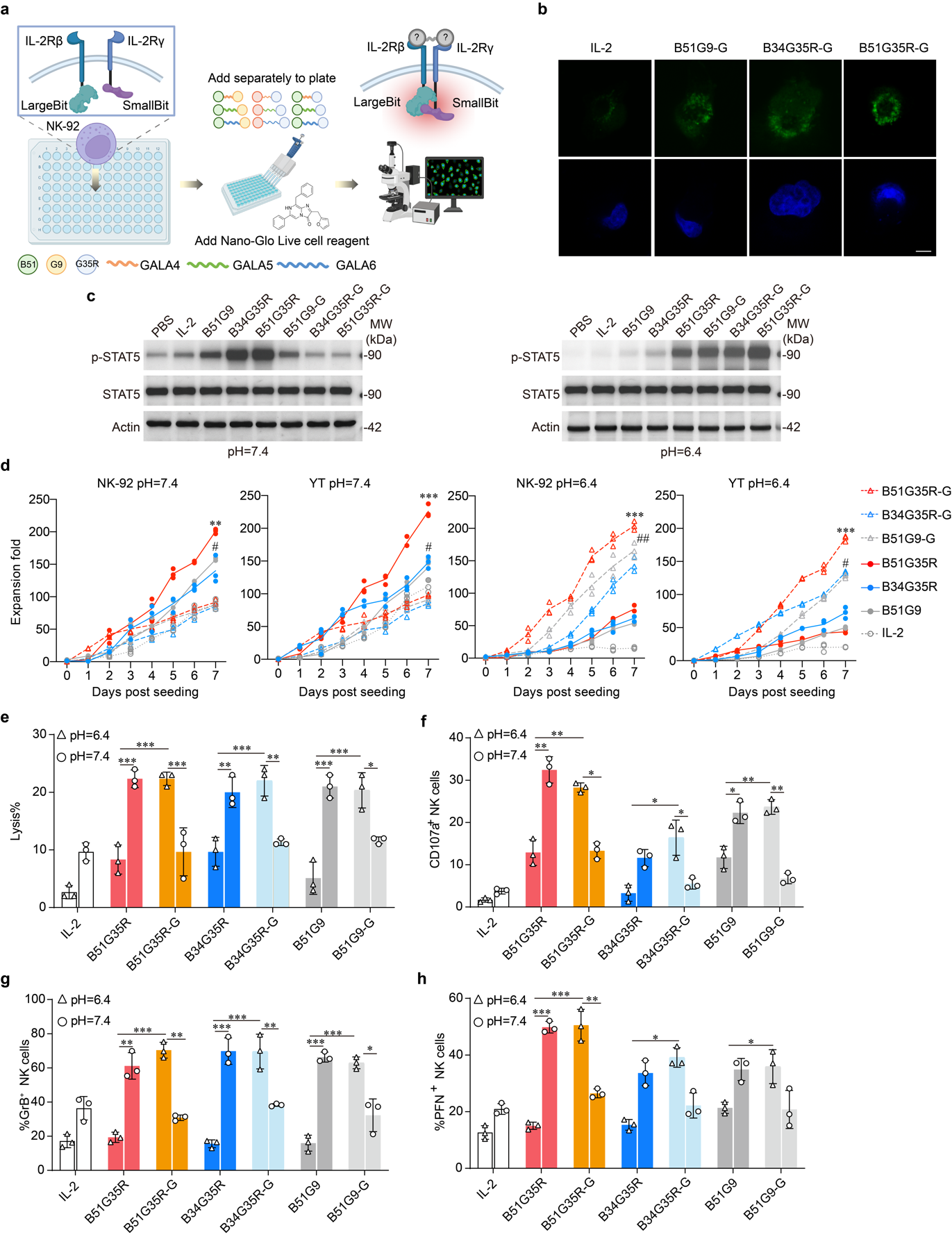 Fig. 5 | Effects of B34G35R-G, B51G35R-G, and B51G9-G on NK cell proliferation and in vitro anti-tumor activity. a, Illustration of the NanoBiT protein complementation assay. The oligomerization induced by fusing LargeBit and SmallBit to IL-2Rβ and IL-2Rγ was verified through immunofluorescence. b, Fluorescence microscopy was utilized to capture images of the NK cells. The green fluorescence indicated the NK-92 cells and the blue fluorescence indicated DAPI, scale bar = 20 μM. c, Expansion fold of NK-92 cells and YT cells at pH=7.4 and pH=6.4 over days post seeding for different constructs (B51G35R-G, B34G35R-G, B51G9-G, B51G35R, B34G35R, B51G9, IL-2). Data are presented as mean ± SD of three independent biological replicates. d, LDH tests for Lysis detection of NK cells expressing IL-2, B51G35R, B51G35R-G, B34G35R, B34G35R-G, B51G9, B51G9-G separately at both pH=6.4 and pH=7.4. Data are representative of at least three independent experiments. e-g, Flow cytometry for CD107a, PFN, GrB detection of NK cells with IL-2 and IL-2 mimics separately at both pH=6.4 and pH=7.4. Data are representative of at least three independent experiments (*P < 0.05, **P < 0.01, ***P < 0.001).